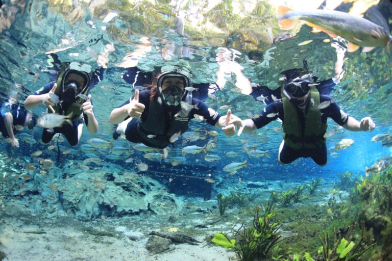 Depois do treinamento, o grupo, acompanhado por um guia experiente, embarca em uma breve caminhada de aproximadamente 15 minutos através de trilhas de madeira até a nascente do rio Baía Bonita. Aqui, borbulhas surgem do fundo do rio em meio a uma profusão de vegetação exuberante, formando um espetáculo único. A área é conhecida como “berçário de peixes”, um verdadeiro tesouro natural.