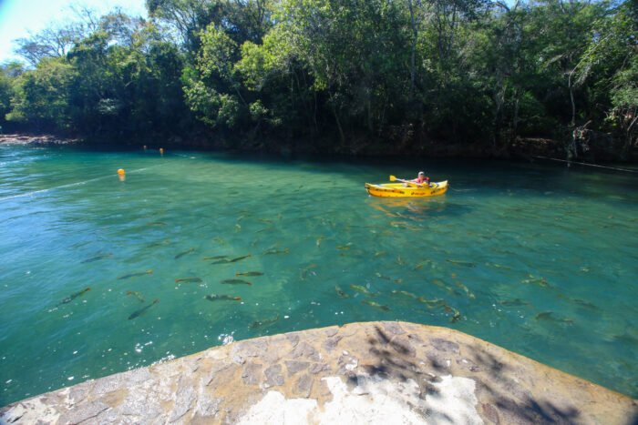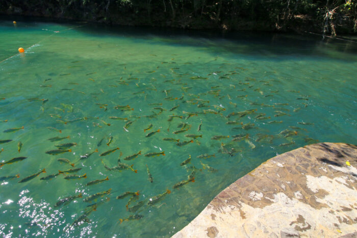 Água cristalina do Rio da Prata, com peixes visíveis a olho nu.