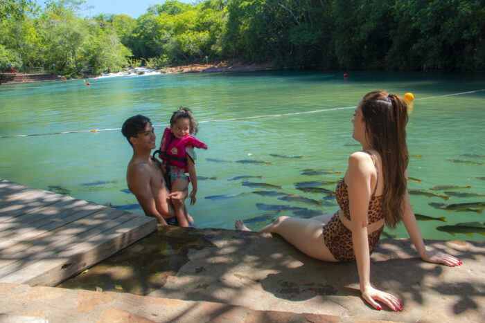 A água é extremamente cristalina, permitindo ver cardumes nadando bem próximos, e o ambiente é amplo, com gramados, áreas de sombra e espaço para famílias com crianças.