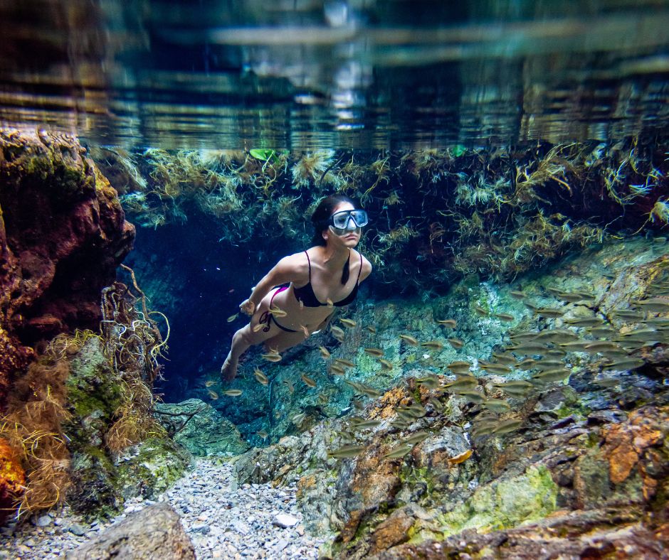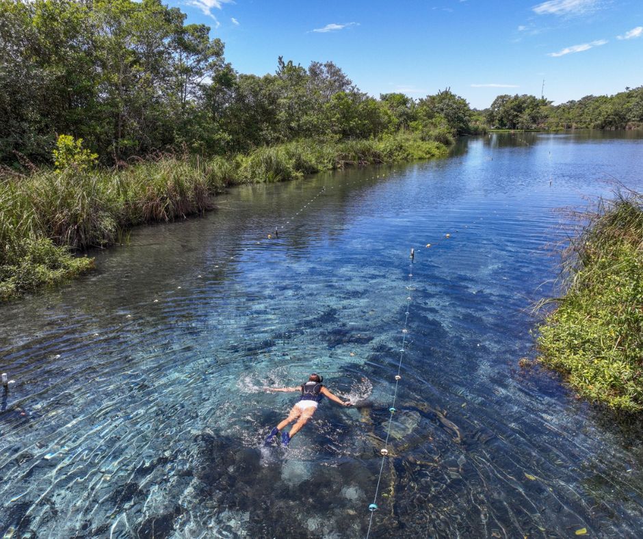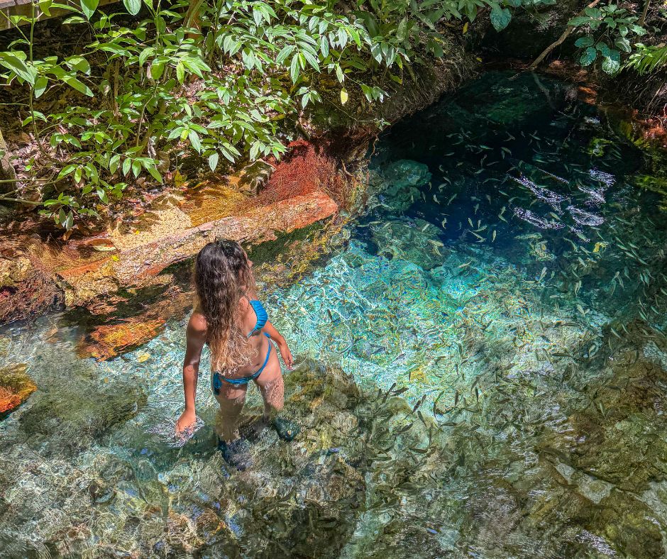 Caverna com nascente submersa: Um dos grandes destaques do passeio é a flutuação na nascente do Rio Chapena, localizada dentro de uma caverna alagada. A água é tão cristalina que parece invisível, e a luz natural cria um efeito visual de tirar o fôlego — experiência única em Bonito.