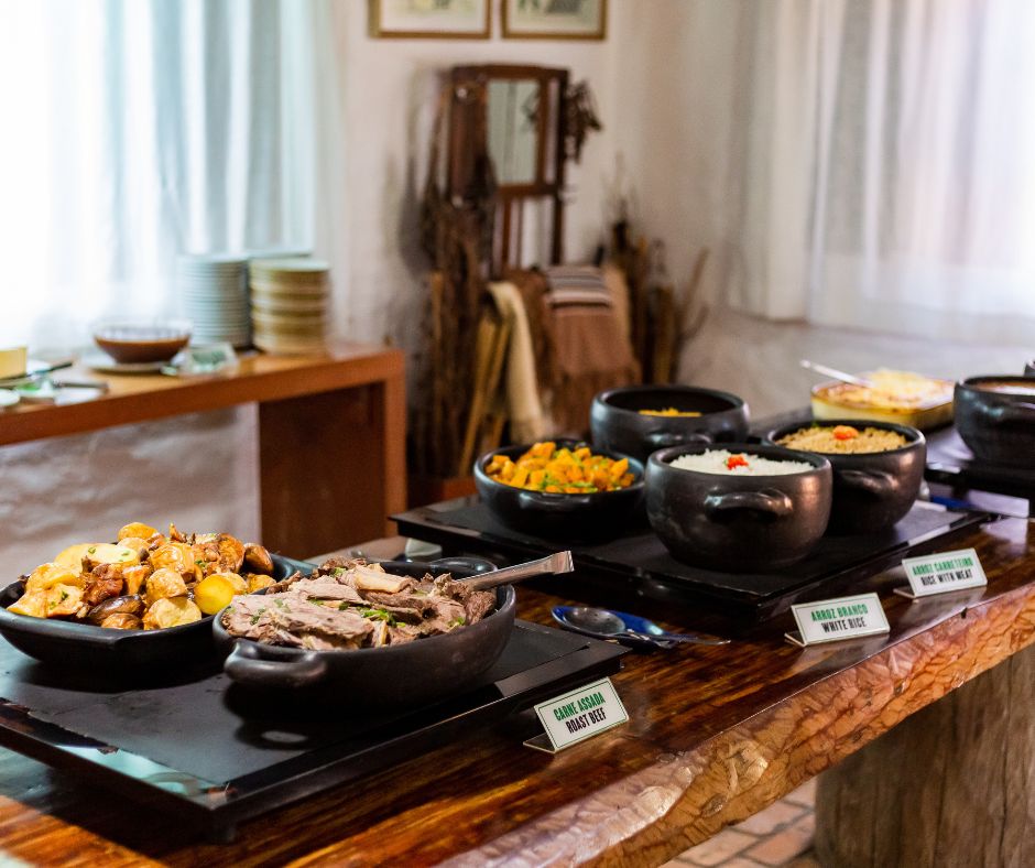 Após o percurso, os visitantes retornam para um almoço típico sul-mato-grossense, incluso no passeio, servido no restaurante da sede com pratos como arroz carreteiro, saladas frescas, carne de panela, galinhada e doces regionais. Tudo preparado no fogão a lenha, valorizando a culinária da fazenda e proporcionando uma experiência autêntica.