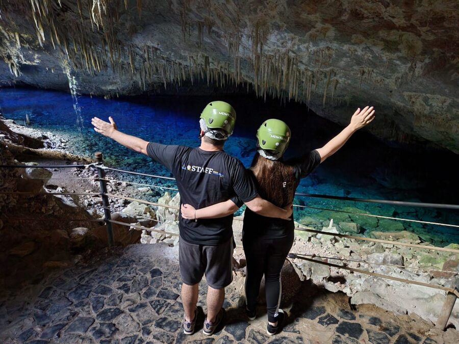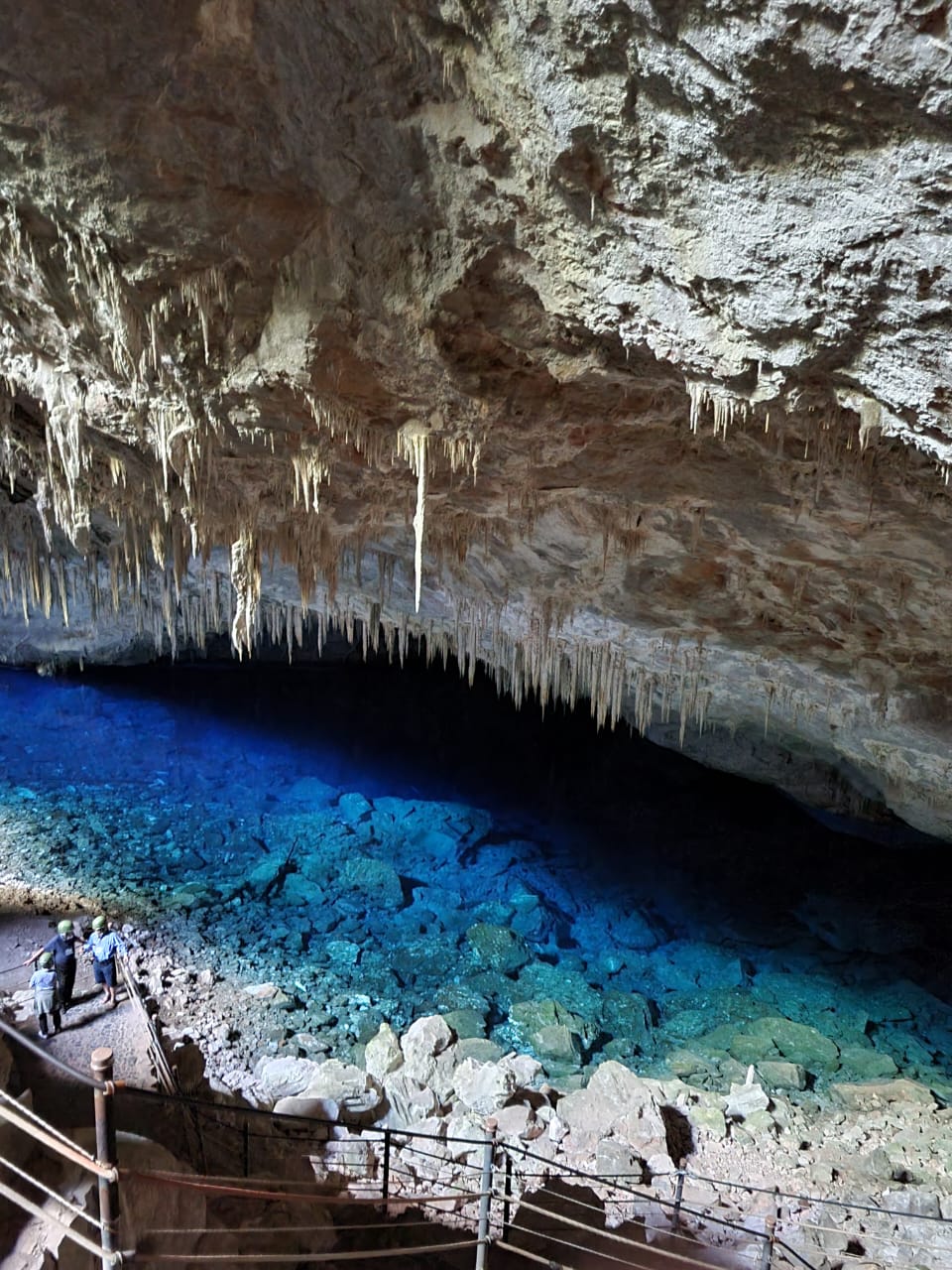 Essa caverna é totalmente contemplativa e a condução é realizada por condutores especializados. Não é permitido nadar ou mergulhar, pois o local é protegido por sua importância histórica e geológica. Logo nos primeiros patamares da descida, já é possível avistar o famoso lago azul e suas formações rochosas esculpidas há milhares de anos. A beleza da gruta se intensifica com a incidência da luz solar entre os meses de dezembro e janeiro, quando o azul do lago atinge sua tonalidade mais intensa.