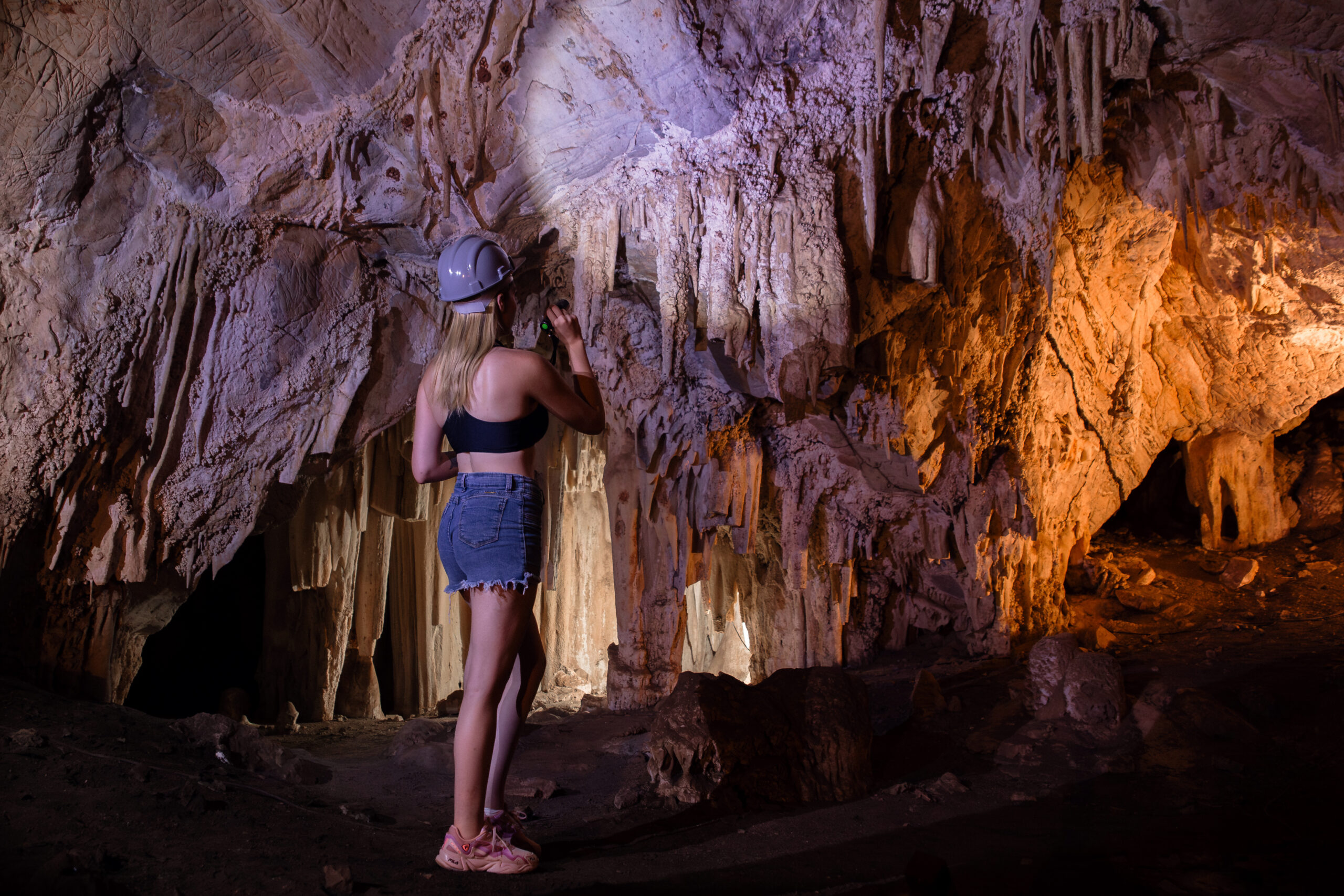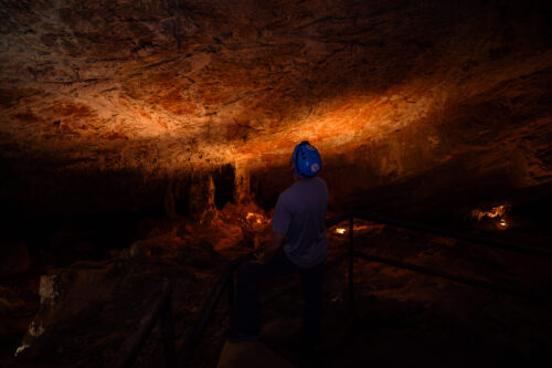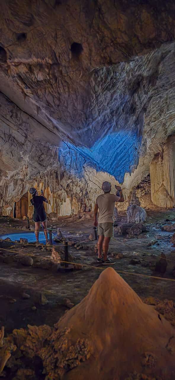 Ao chegar à entrada da caverna, o guia distribui lanternas e capacetes para a exploração. Dentro da gruta, você se depara com estalactites, estalagmites e outras formações espeleológicas impressionantes, esculpidas pela natureza ao longo de milhões de anos. A iluminação artificial destaca esses detalhes, criando um ambiente quase mágico.