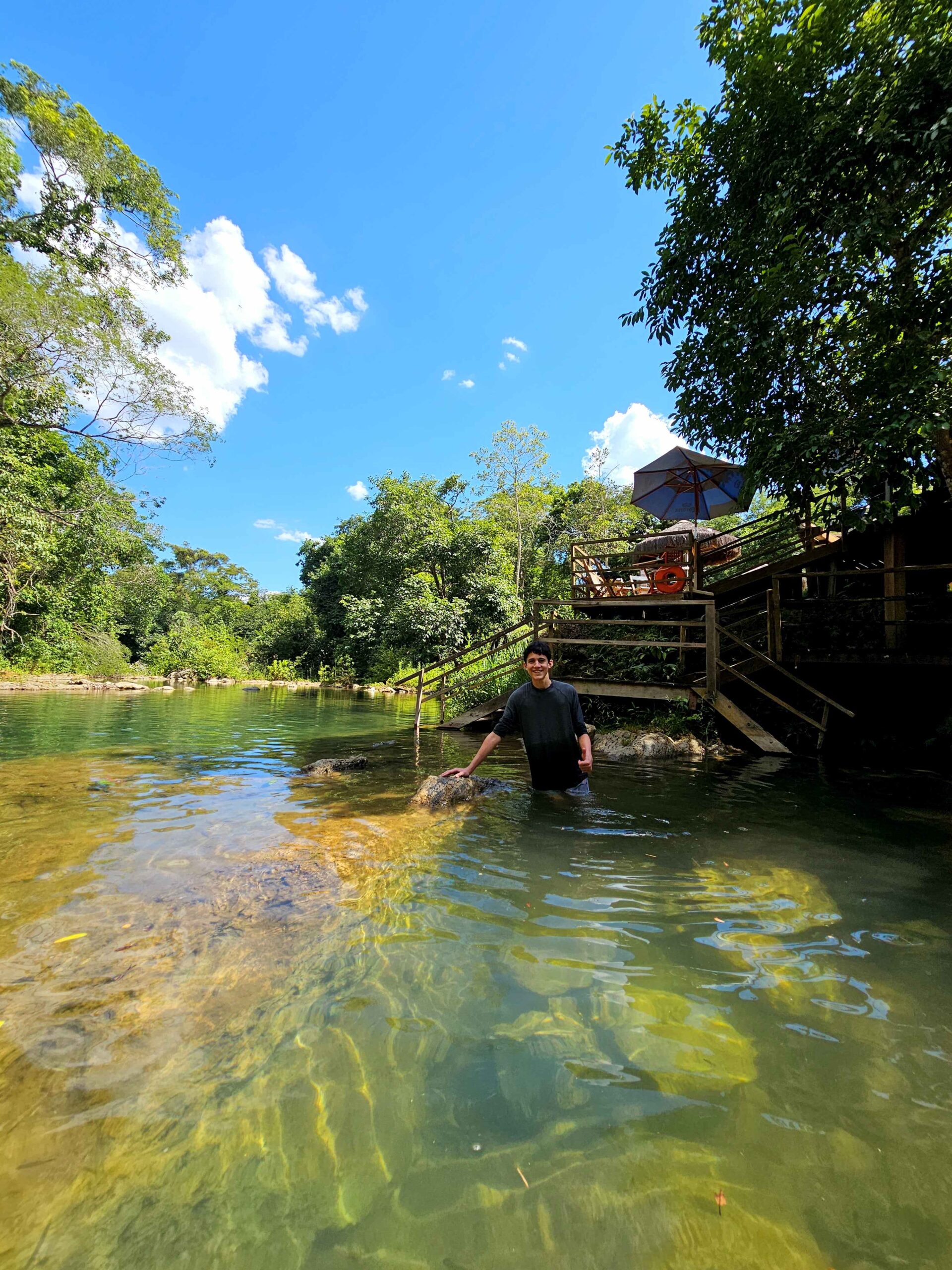 A piscina natural do receptivo, alimentada pelo rio, costuma ser mais fria que as cachoeiras, o que surpreende quem mergulha depois de caminhar sob o sol.
