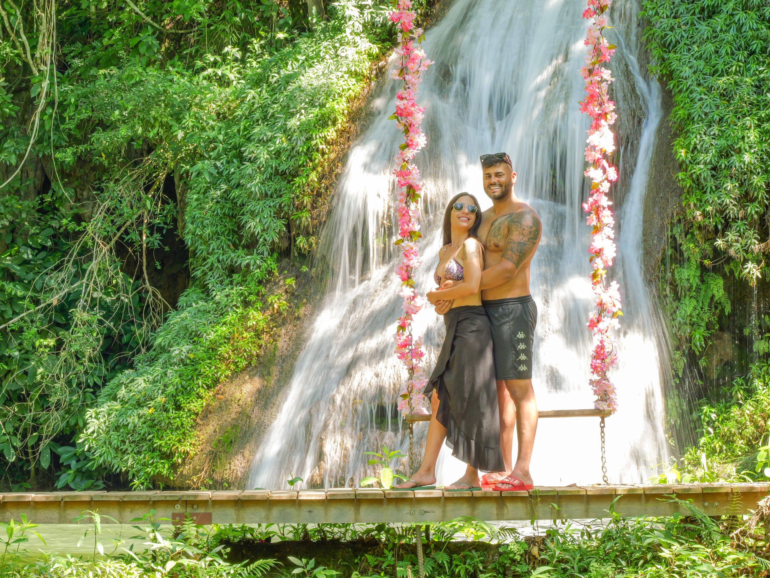 Durante o trajeto, são feitas paradas em sete cachoeiras diferentes, todas próprias para banho. Algumas têm decks de madeira, outras têm escadinhas de acesso ao rio, e há até uma com um coração esculpido na pedra — a famosa “Cachoeira do Amor”, onde os casais sempre param pra foto. O salto na última cachoeira, chamado “Salto do Amor”, é permitido apenas para maiores de 12 anos. Já gestantes acima de 24 semanas e pessoas com restrições de mobilidade não são liberadas para a trilha, mas podem curtir a estrutura do receptivo com day use.